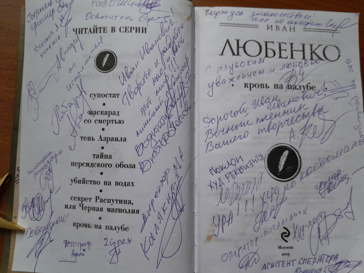 Одна книжка из тиража предыдущего пятого издания романа «Кровь на палубе» мне особенно дорога, потому на ней поставили подписи и написали свои пожелания члены съёмочной группы, от водителя до режиссёра. Ну и, конечно, Антон Хабаров с другими актёрами. Есть у меня подобные книги и по остальным экранизациям.