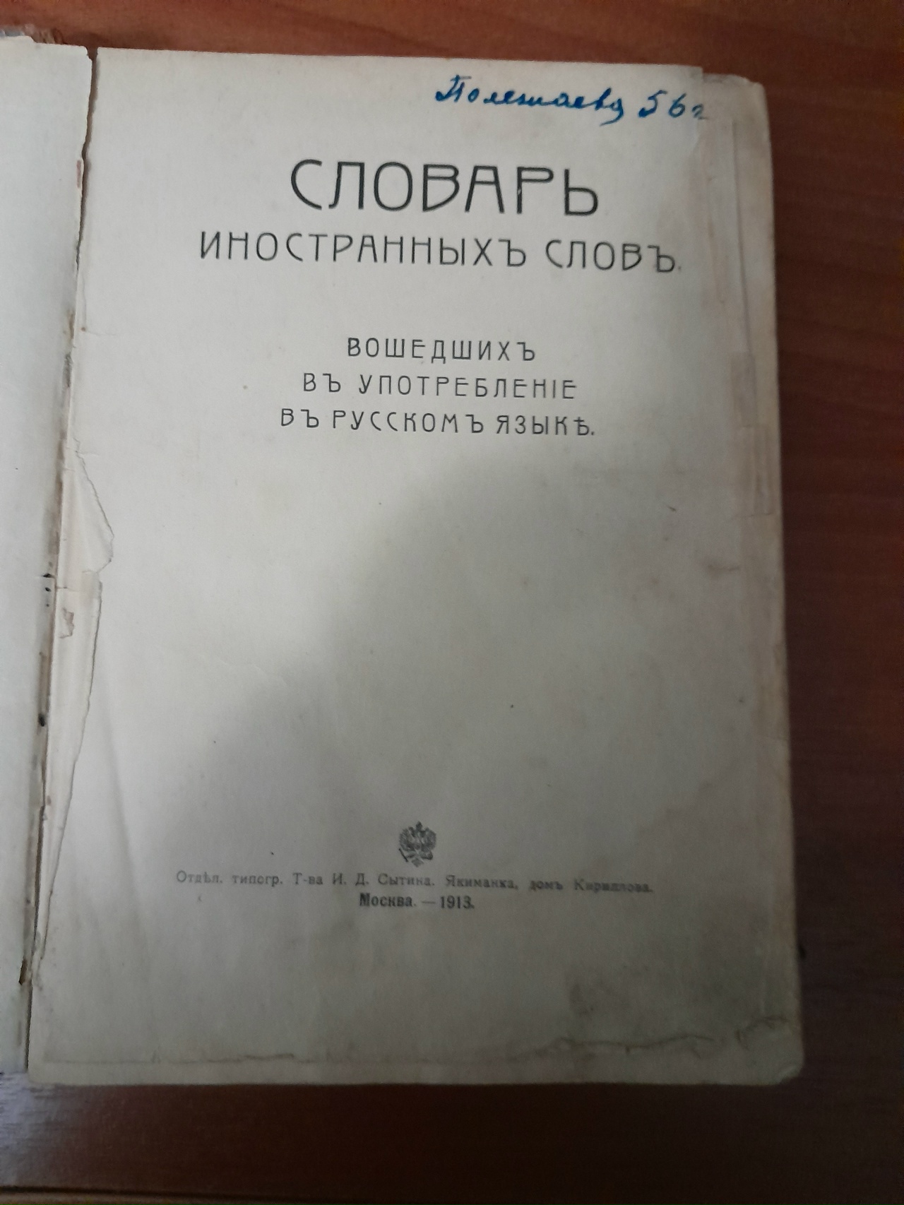 Посчастливилось купить для работы «Словарь иностранных слов, вошедших в употребление в русском языке» 1913 года. До этого я пользовался «Словотолкователем» 1896 года. Мои читатели знают, что я часто даю сноски из него. Так вот в нём ещё нет слова «автомобиль», а в этом уже есть. Книжку придётся, конечно же, переплести. Хозяева словаря из Черкесска (станица Баталпашинская). Их предки работали учителями. Словом, книга уже второе столетие будет образовывать людей.