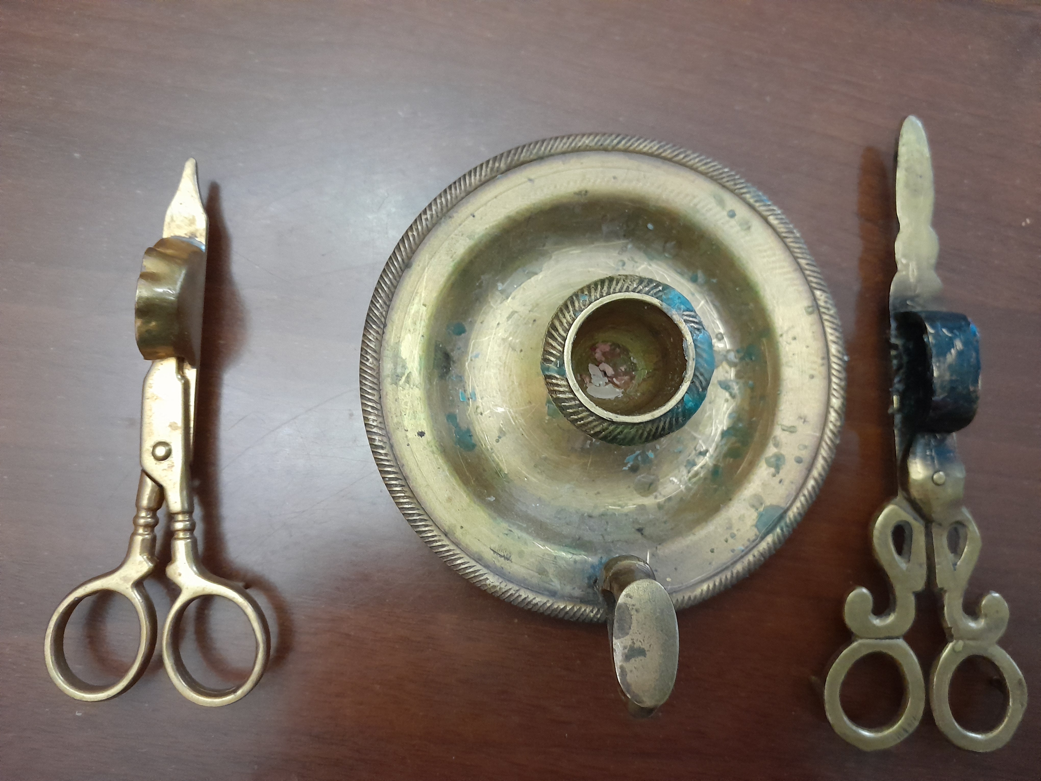 Благодаря «наводке» моего старого читателя из г.Омска Евгения Миронова мне удалось купить совсем по разумной цене ножницы для обрезания фитиля со свечегасильником. Это шведские, конец XIX-нач.XX века (на фото слева). Лет пятнадцать назад я купил подобные в Стамбуле. Они на фото справа. На турецких отчётливо просматривается восточные узоры, а эти более строгие.